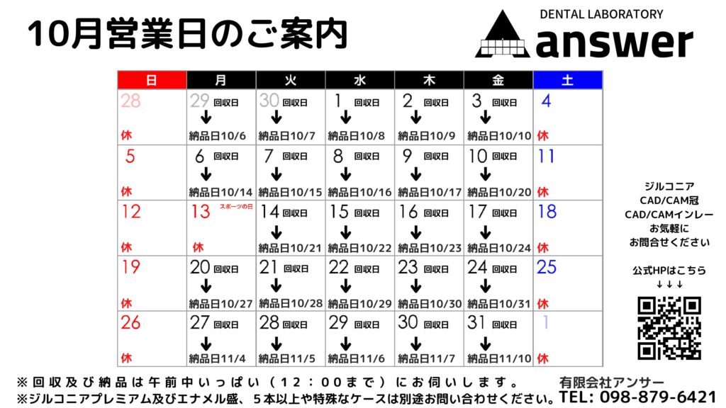 10月も通常どおり営業させて頂きます。定休日:土日祝 納期については別添えの資料のとおりです。ジルコニアプレミアム、エナメル盛、5本以上や特殊なケースお急ぎについてのご相談はお電話にてよろしくお願いします。 電話098-879-6421 10月の納品日のお... -
