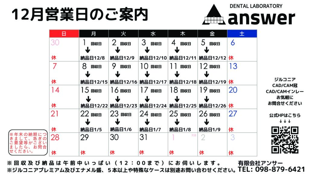いつもご愛顧いただきありがとうございます。12月の納期については別添えの資料のとおりです。ジルコニアプレミアム、エナメル盛、5本以上や特殊なケースお急ぎについてのご相談はお電話にてよろしくお願いします。年末年始休業:2025年12月27日(土)... -