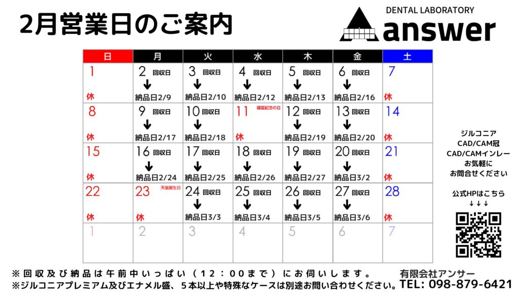 いつもご愛顧いただきありがとうございます。2月の納期については別添えの資料のとおりです。ジルコニアプレミアム、エナメル盛、5本以上や特殊なケースお急ぎについてのご相談はお電話にてよろしくお願いします。098-879-6421 引き続きよろしくお願いい... -